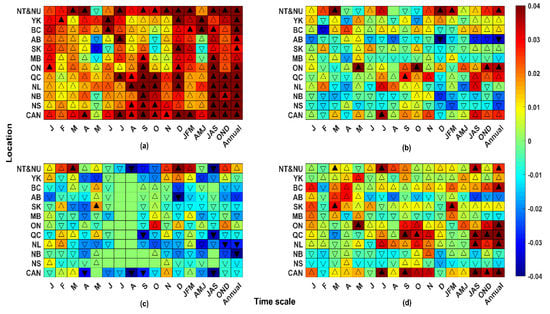 We apply the Mann-Kendall trend test to the anomalies of upscaled climate variables at monthly, seasonal, and annual scales. The results are illustrated in Figure 2 using a set of standardized heat maps, in which x-axis indicates, monthly, seasonal, and annual time scales, respectively from left to right. Political regions are shown in the y-axis and are ordered based on their location. From top to bottom, it starts with northern regions, then goes from west to east and finally shows Canada as a whole. In each cell, the magnitude of trend in anomalies of climate variables are color coded based on a unified scheme to allow comparison between different variables. Upside and downside triangles indicate positive and negative trend, respectively. Significant trends at 95% confidence limit are shown by filled triangles.