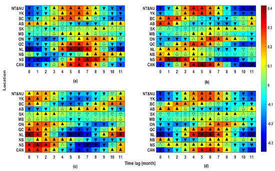 The results of the Kendall tau test for identifying lagged dependency between (a) temperature and hydropower production, (b) precipitation and hydropower production, (c) snowfall and hydropower production, and (d) rainfall and hydropower production across Canadian political regions. For each case, the magnitude of dependency is shaded by the color code in the side bar. The direction and significance of dependency is shown with the triangular (upward positive, downward negative; filled significant, unfilled not significant). Significant level is considered at 95% confidence limit.