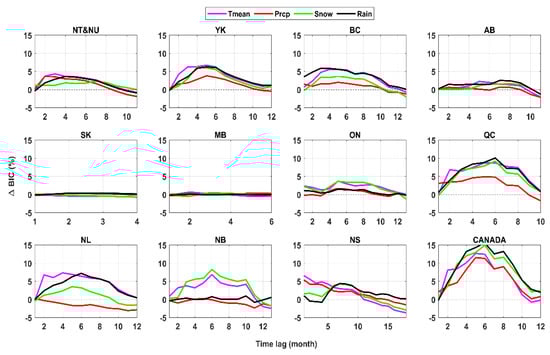 For each region and time lag, the climatic variable that causes the maximum improvement in the BIC can be identified as the dominant climate variable in the considered time step. Based on the analyses made, dominant climatic causes of hydropower generation can differ based on the region and the time lag considered. In NU and NT, temperature seems to be the dominant driver in majority of time lags from one to eight months, although precipitation and rainfall mark similar improvements during earlier and later lag months, respectively. In addition, snowfall becomes the dominate driver in this region after eight months lag, which indicates the buffering effects of snow accumulation that causes delay between snowfall and hydropower generation. In YK, again temperature is the key driver of hydropower generation across a yearly timespan; however, snow and rain make almost the same improvement in prediction as temperature after four months lag. In BC, rainfall stands as the dominant climate driver, particularly within the first four months lag. After that, temperature plays almost a similar role in predictability of hydropower generation. In AB, rainfall stands as the dominant climate driver, although temperature becomes a stronger driver for five and six months lag. SK and MB show marginal effects of regional climate drivers on predicting the hydropower generation due to small contribution of regional climate in forming regional streamflow. In ON, temperature and snow stand as dominant climate causes of hydropower production, pointing on how snow accumulation and melt drive hydropower generation in this province. Similar process can be witnessed in NB. In QC, the hydropower is driven by a complex interplay between rain, snow and temperature within a 10-month time span. In NL, hydropower generation is mainly driven by temperature, although rain plays an almost similar role after six months lag. NS displays rather a complex hydropower generation process in which temperature and total precipitation are the main causes of hydropower production up to five months lag and then rainfall and snowfall takeover up to 10 months lag but only rainfall can be considered as a cause beyond 10 months and up to 15 months lag. In Canada as a whole, the total precipitation is the immediate cause of hydropower generation, which is substituted by temperature for two and three months lag. After month four and up to one year lag, rainfall and snow become dominant drivers of hydropower production, although rainfall has a more important role in predictability of hydropower generation compared to snowfall.