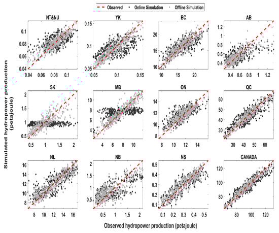 Comparison between observed (x-axis) and simulated (y-axis) monthly hydropower production across Canadian provinces and territories. Simulated results are provided in online (dark gray) and offline (light gray) simulation modes. The red dashed lines show the 1-1 line.