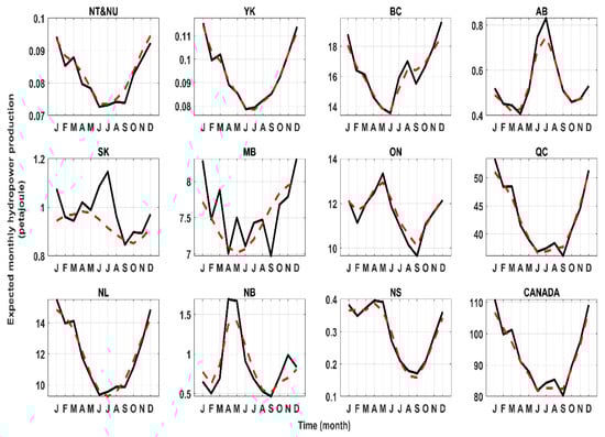 Before implementing the non-falsified models for impact assessment, the reliability of predictive models should be inspected in terms of their performance in tracking the expected monthly hydropower production during the historical period. To do so, we introduce the historical climate data to non-falsified models to simulate the monthly hydropower time series in the online mode. We then average all the yearly hydropower profiles to come up with an expected time series of monthly hydropower production in a typical year. The results are shown in Figure 6, revealing that the expected values of hydropower production gathered from simulations are close to the observed values in most of the Canadian regions, except in SK and MB.