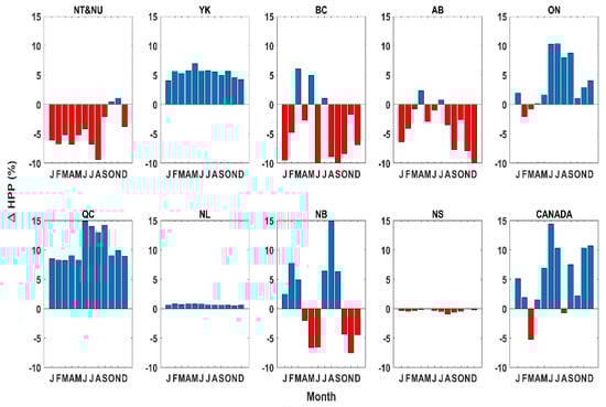 In NU and NT, there are lower expected values in all months except October and November. The maximum expected decrement in hydropower production potential takes place around 10% in August. On the other hand, hydropower is expected to increase under the continuation of historical trends in climate variables across YK, where the maximum gain will occur in March by 8% and other months will experience increases in generation by around 5%. In BC, the expected effect of continuation in hydropower production potential varies throughout a typical year, but it decreases during summer and fall. The maximum gain will be in March around 8%, while hydropower can decrease by around 10% in September. In AB, the hydropower production potential experience a maximum increase of 3% in April but can also suffer from maximum expected loss of 10%, captured in December. In ON, hydropower production potential is expected to increase in spring, summer, and fall but can decrease marginally in winter. The maximum gain in hydropower production potential will occur in June and July by around 10%. Higher hydropower production potential is expected under the continuation of climate trends in QC, with the maximum gain of around 15%, taking place in June. NL and NS will experience marginal changes in their production potential. In NB, hydropower production potential is expected to increase during the winter and summer but to decrease in spring and fall. The maximum gain in this region is expected to take place in August by around 15%. Looking at Canada as a whole, hydropower production potential is expected to increase in all months except in March and August. The maximum gain is expected by around 15% in June and the maximum loss is in March by around 5%.