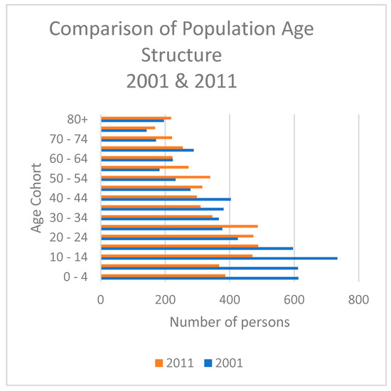 In the late 1970s, according to the Grenada’s Central Statistics Office in the Ministry of Finance, the population of Grenada was approximately 110,000, but by the mid 1980s, it had dropped to 90,000 and has not fully recovered. According to the 2011 census, the population of Grenada was 105,538, whilst that of Carriacou was 5633 [12]. At the beginning of the 19th century, the recorded population of Carriacou was around 3500 persons, gradually increasing until it peaked at 7100, thereafter showing a gradual but consistent decline [11]. The more recent changes in overall population are shown in Figure 3, whilst the change in population age structure is shown in Figure 4 [12]. The percentage of the population under the age of 20 has declined from 41% in 2001 to 30% in 2011 and in absolute terms by 844 persons, whilst the proportion of the population over the age of 60 has increased to 20% of the population in 2011. Whilst the number of households has shown an upward trend since 1980, the mean household size has declined from 3.8 persons in 1981 to 2.69 in 2011 [12].