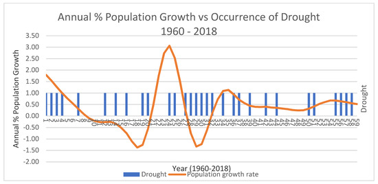 Annual population growth vs. occurrence of drought conditions, 1960–2018 (1 = 1960 on x-axis).