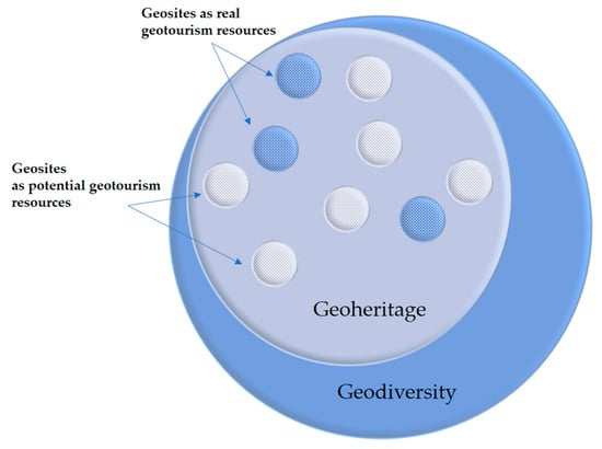 So as to avoid any ambiguity in understanding of the basic concepts used in this research paper, its authors have presented them in a visual form (Figure 1) and proposed the following definitions. The notion of geodiversity entails all the possible elements related to the inanimate nature, regardless of their scale. Hence, geodiversity comprises both single sites, such as individual rocks and minerals, as well as surface elements, i.e., mountain ranges, uplands, etc. Within the concept of geodiversity, one can differentiate the elements that are valuable witnesses of the natural processes, which are unique in character, or for other reasons that are cognitively important. These elements of an inanimate nature can be defined as geoheritage. Geosites, on the other hand, are the integral components of geoheritage that due to their smaller scale can be perceived holistically by the public. Most geosites can be classified as potential resources for geotourism, whereas only the ones of the greatest scientific value that, at the same time, are adequately prepared to the needs of the tourist traffic (in the form of the existing infrastructure) can be referred to as the real or actual geotourism resources that constitute the basis for creating the geotourism products.