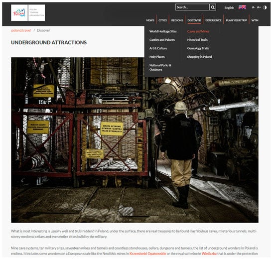 Only two steps need to be taken in order to find the geotourist information in the case of the Polish Tourism Organization, where one of the main bookmarks—Discover—leads the reader to the article named Caves and Mines: Underground Attractions (Figure 2). However, it has to be stated that the above-mentioned are only two examples of attractions within the interest of geotourists.
