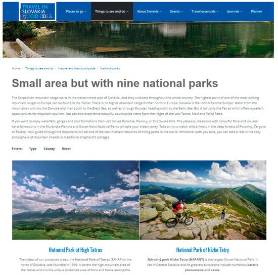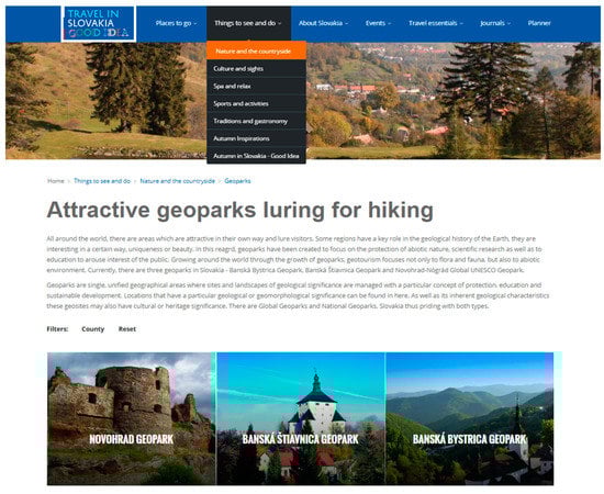 The access path of three steps was required by the Slovak Tourist Board to find a separate article on Geoparks, which was most appropriate from the perspective of geoheritage protection and the geotourist offer (Figure 3). At the same time, it was not singled out as an individual subcategory on the websites of the Polish and Czech NTOs, which is not understandable, as all three countries can pride themselves on having geoparks belonging to the Global Geoparks Network, not to mention the ones of the national and local rank.