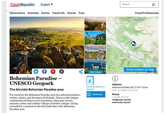 Additionally, and quite surprisingly, even though all three countries advertise their cultural and natural resources under the auspices of UNESCO, none of them even mentions in the main article that certain geoparks within their area belong to the Global Geoparks Network, and hence can be referred to as UNESCO Global Geoparks. According to the Global Geoparks Network [], “UNESCO Global Geoparks are single, unified geographical areas where sites and landscapes of international geological significance are managed with a holistic concept of protection, education and sustainable development”. As it is a relatively new initiative that originated in 2015, the website’s content and the way in which information appears on the page should be updated and follow the newest trends and guidelines for the tourism industry and nature protection. Czech Tourism uses the name “Bohemian Paradise–UNESCO Geopark”, but as stated before, not in the main article devoted to the UNESCO sites of the country, and this piece of information is available after knowing the following access path Activities–Active Holiday–Natural Heritage–Protected Areas–Bohemian Paradise UNESCO Geopark (Figure 6). In addition, in the case of Poland, even though the Muskauer Park (Park Mużakowski) in Łęknica, as one of the greatest examples of the 19th century gardening architecture in Europe, is advertised under the access path of Discover–World Heritage Sites–Muskauer Park, no information whatsoever, even in the form of a hyperlink, is given on the fact that it lies within the Muskauer Arch Geopark area, which is the only Polish geopark that is on the list of the Global Geoparks Network under the UNESCO auspices. The Slovak Tourist Board seems to have made the information on the Novograd-Nógrád UNESCO Global Geopark most easily accessible via Things to See and Do–Nature and Countryside–Geoparks—Novohrad Geopark. It is understandable that the main article on the UNESCO-listed heritage of each country predominantly focuses on the most recognizable lists. Notwithstanding, since selected geoparks function under the same patronage, it is worth at least mentioning this fact or providing a proper hyperlink.