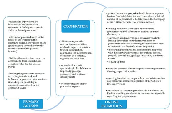 To summarize, the actions conducive to the accurate presentation of geotourism resources on the NTOs’ websites, as presented in Figure 7, are threefold. All three levels, namely the primary actions focused on the geotourism resources per se, followed by undertaking the cooperation of the experts in three realms of knowledge, and finally, the actions concentrated on the e-aspect of their promotion are of equal importance. It is worth emphasizing that as far as the very first step of actions to be taken is concerned, the scientific value of geosites is of utmost importance. The procedure of their recognition, exploration, and taking an inventory of the sites can vary in different countries. Nevertheless, the elements that the above-mentioned procedure usually have in common are being drawn by teams of academics, most frequently specializing in geology, and financed among others from the ministerial funds. To exemplify, in Poland, the binding documents drawn in this respect in 2006 and 2012 respectively were: