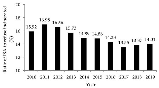 Figure 1. The variations of the ratio of incineration bottom ash (IBA) generation to refuse incinerated since 2010 [12].