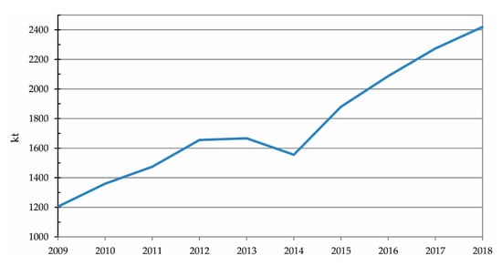 Importation plays a marginal role as a source of limestone commodities in Poland. Small amounts (usually several thousand tons per year), predominantly of limestone flour, were primarily imported from the Czech Republic. At the same time, foreign sales of these products were systematically increasing (to 1.0–1.3 million tpy in the last two years) and mainly went to Germany [].
