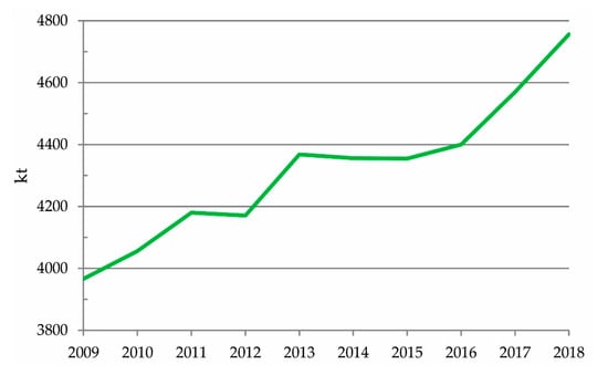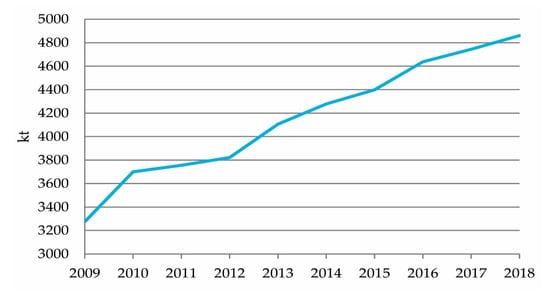 The constant trend observed over the last decade on the Polish paper market has been a growing demand for paper and coated board for the production of packaging (cartons, boxes, cases) coupled with increased consumption of coating pigments. As a result, some paper products may contain even more than 50% of pigments (both kaolin and GCC + PCC or their mixes). According to the Statistics Poland (GUS) [], in 2009–2018 the production of paper and board in Poland grew by nearly 150% (to 4.9 million tpy, Figure 6), while the production of paper or board cartons and boxes grew by 175% (to 2.7 million tpy.) At the same time, the production of corrugated board doubled to 2.4 million tpy. Another characteristic feature of the paper market in Poland, as in other countries in the world, is the declining demand for newsprint paper (since 2009 its production decreased by 60%, to ca. 70 kt in 2018) as well as flat demand for other graphic grades (which stood at ca. 700 ktpy). This is a clear indication of the reorientation of the paper industry towards the production of special kinds of paper and carton packaging resulting from, among other reasons, continuing digitalization [,,].