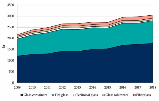Since the beginning of the 1990s, the production of glass in Poland has been continuously growing, and in 2018 it exceeded 3 million tons (Figure 5). This mostly resulted from the increase in container and flat glass production—the two most dynamically developing branches of the domestic glass industry. In the structure of glass production in Poland, as in the rest of Europe, glass containers are prevalent, accounting for 58% of the total glassware sales in 2018, while flat glass (mainly for building and automotive applications) represented 34% [,]. Household glass (tableware, craft, and crystal glass), technical glass (laboratory, lighting, and electro-technical), and a wide range of products based on glass fiber were of lower importance.