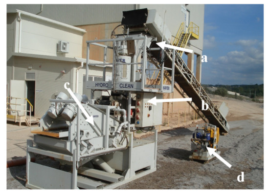 Pilot-scale washing installation Hydro-Clean HC 350 device: (a) Feeder, (b) washing unit, (c) de-watering screen, (d) power source [19].