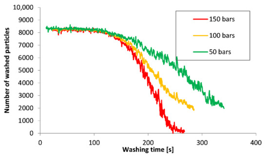 Average number of washed particles of impurities during the process for various washing pressures.