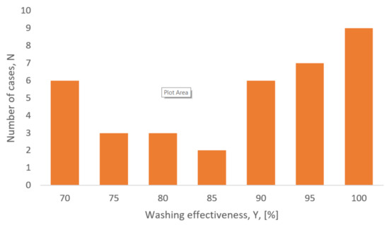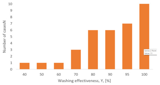 The results obtained for limestone are characterized by a rather high or very high washing efficiency. The fewest number of results were obtained with washing effectiveness lower than 70%, with average with values between 75 and 85%. Only in three cases was the obtained washing efficiency lower than 70%. A histogram of results is presented in Figure 5.