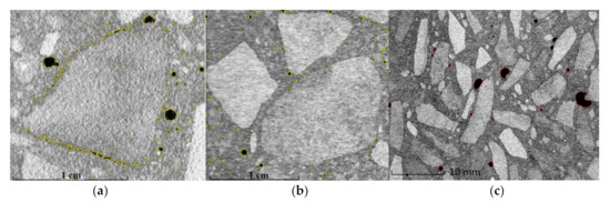 The porosity of the concrete, resulting from absorbing air while making a mixture, looks different. Flat particles introduce turbulent movement into the mortar and large contact pores are formed at the particle boundaries (Figure 6c), and, in case of cubic particles, this process is limited. Computer tomography allows distinguishing different types of pores observed in hardened concrete. Figure 6c shows washed aggregates with flat particles. An absence of fine pores at the surface of the particles (on the contact layer) and the presence of large ones, especially in the corners of the irregular aggregate, can be observed. An impact of mineralogical composition on the washing process and the subsequent quality of concrete mixes is under testing.