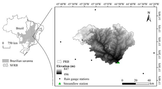 The Pandeiros river basin (PRB), located in the north Minas Gerais State, is inserted in the Brazilian savanna and has an area of 3220 km2. Due to its ecological relevance for the Brazilian savanna and for the SFRB, the Pandeiros River Environmental Protection Area was created through State Law n° 11,901 to protect the native fish species, which represent 70% of the reproduction and development fish from the middle São Francisco River [,]. Figure 1 shows the PRB location, the streamflow and rain gauge stations, and the Digital Elevation Model (DEM) ALOS (Advanced Land Observing Satellite) PALSAR (Phased Array L-band Synthetic Aperture Radar), with a spatial resolution of 12.5 m.