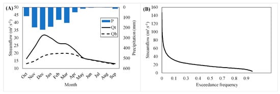 Hydrograph containing average monthly precipitation (P), total streamflow (Qt), and baseflow (Qb) (A); and permanent flow curve (B).