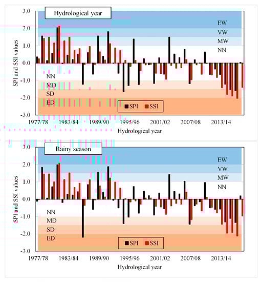 SPI and SSI results for hydrological years and rainy seasons in the PRB.