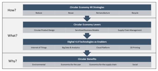 The implementation of the three levers can be enabled by digital 4.0 technologies []. Internet of Things (IoT) technology refers to sensors applied to mechanical appliances or electronic equipment and gives information on conditions and functioning of the products [,,,]. Big Data and Analytics allow revising data collected by IoT to improve decision-making processes and prevention systems []. Cloud platforms are software that allow sharing data or multimedia materials, to enhance the offer of services rather than products and the rise of the platform economy []. Three-dimensional (3D) printing allows realizing 3D objects starting from a computer model through additive manufacturing [].