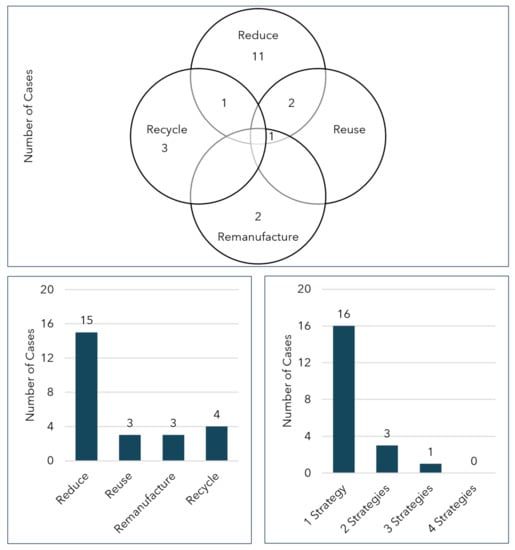 The literature proposes an ideal hierarchy to follow among the 4R strategies to achieve CE []. This hierarchy considers reduce practices as the most valuable, followed by reuse, remanufacture and recycle, since much of the value remains in the product []. Accordingly, organizations should at first implement resource efficiency and waste prevention. Then, they should try to reuse products as much as possible. When reusing is not feasible, they should try to remanufacture them. Lastly, they should recycle waste to recover raw materials. The initiatives in the paper slightly follow this hierarchy, since 15 cases on a total of 20 follow the reduce strategy, while 3 exploit reuse practices, 3 initiatives concern remanufacture and 4 initiatives pursue recycling (Figure 2). Even though some literature claims that reduce strategies do not deal with waste [], they are worthwhile for a CE. Reduce is a prevention approach, and it is the first step to reach a CE because it deals with the potential abolition of the concept of waste. On the contrary, strategies such as reuse, remanufacture and recycle deal with the reprocessing of products which are already or nearly waste. Nevertheless, the initiatives investigated show that recycling practices are more common in the household appliance industry than reuse and remanufacture. This can be explained by the fact that household appliances have long been subject to the WEEE legislation. For instance, in Europe, the 2002 WEEE Directive, and its recast in 2012, sets targets for the collection and recycling of the waste from household appliances []. According to the literature, CE initiatives should apply the 4R strategies in a systemic cascading process [,]. However, no initiative pursues all the 4R concurrently, and most of them (16 out of 20) employ only one single strategy.