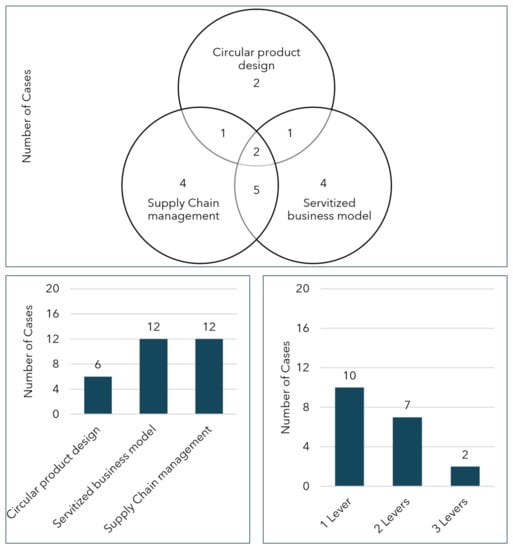 The levers mostly employed are, from one side, the shift from linear sales to servitized business models and, from the other, supply chain management (Figure 3). In fact, 12 cases out of 20 apply servitized business models to facilitate the transition towards CE. These could be easier to implement than circular design strategies since changes in the business model do not require to modify facilities or production techniques. On the other hand, supply chain management has been adopted especially through collaboration and reverse logistics. The high number of initiatives that applied collaboration confirms the need for a more holistic and shared approach for the transition to CE. Circular redesign is still a practice rarely used, since only 6 cases out of 20 introduced circular design practices in their production processes. Approaches to easier disassemble or improve material selection are still in a prototypical phase and are far from being implemented on an industrial scale. There are, indeed, many circular design ideas and proposals, but they need a radical change as well as extensive funding. The analysis also shows that 7 cases out of 20 combine two levers to achieve CE. However, only two initiatives employ them all. In its pilot project, Groupe SEB leveraged 3D Printing to enable repair services (product-oriented servitized business models) on products purposely redesigned for enhancing repair and parts substitution (circular design) in strong collaboration with technical assistance centers (supply chain management). By joining the ResCoM and the ReCiPSS EU-funded projects, Gorenje leveraged IoT to offer washing machines through leasing-based as-a-service contracts (servitized busines models), these washing machines are redesigned for enhancing remanufacturing (circular design), in joint collaboration with an ecosystem of actors such as technology providers (supply chain management). Despite these two exemplary cases, systemic initiatives of a joint adoption of CE are lacking. It is worthwhile to stress that both the initiatives are far from achieving an industrial scale, since to date both Groupe SEB and Gorenje are still running pilot projects.