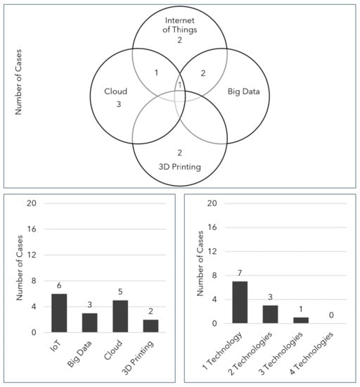 The IoT is a technology used by several initiatives that makes possible the data collection indispensable to offer servitized business models such as pay-per-use contracts. Big Data and Analytics generally employ data collected through IoT to create customer value in the service offering. They imply a more accurate analysis and have thus been exploited by fewer initiatives. Cloud platforms are required especially for initiatives based on sharing. Platforms, indeed, revolutionized the organization of sharing, allowing to extend it to the entire digital community. These three technologies emerged as relevant for the servitization of business models, where appliances are offered as-a-service: IoT is used for collecting data from users and for billing purposed, Big Data are analyzed to personalize the service offer in order to respond to customer needs and Cloud platforms are used to enhance appliances sharing (Figure 4). On the other hand, 3D printing emerged as relevant for repair processes, even though still quite underdeveloped (only 2 cases out of 20 adopted such a technology). Overall, the number of initiatives that employ at least one digital technology is remarkable (7 out of 18), but there is still room for extension and for a joint adoption of all these technologies. In this regard, the initiatives that apply 3D printing are part of a different context, so that it is not unexpected if 3D printing appears alone, not combined with the other technologies. However, a simultaneous use of IoT, Big Data and Cloud would be desirable, since they deal with the same set of data. The exploitation of digital technologies can be extremely advantageous, but many organizations may consider this investment too risky.