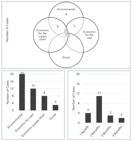From the analysis of the 20 cases emerges that each initiative reached environmental benefits (Figure 5). This is an expected result, matching the origins of CE. Benefits for customers immediately follow: 12 cases out of 20 obtained these goals. Benefits for customers are indispensable to achieve a change in customer behavior and to allow the initiatives to consolidate and scale-up over time. Eight projects out of 20 increase profit for the supply chain, by paying less in materials, and by saving on dismantling and landfill costs (e.g., Norsk Ombruk). Interestingly, no case mentioned potential benefits regarding the compliance to environmental regulation such as carbon taxes. This can be explained by the fact that information coming from companies’ websites may focus on drawing attention to benefits for customers or for the environment, rather than on positive consequences for the supply chain. Nevertheless, great attention should be paid to them. Otherwise, companies and organizations would not be prompted to take the potential risks related to a significant change in their way of doing business. Finally, only three cases reached social benefits. Even though academics stress that a CE model should include the social sphere [], very few companies in the household appliance industry focus on them. Globally, only 3 initiatives out of 20 achieved all the four categories of benefits. It is important to stress that it is now necessary to consider CE in a more holistic way, to include the three pillars of sustainability.