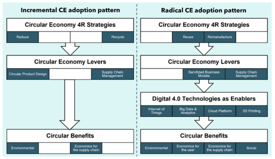 Based on the cases analysis and on the above discussion, two main different patterns of adoption of CE in the household appliance industry emerged from the cases, i.e., incremental vs. radical adoption approaches, as shown in Figure 6. Figure 6 highlights only the CE Research Framework elements (i.e., strategies, levers, enablers and benefits) touched by incremental and radical adoption patterns, respectively. While incremental approaches seek to improve existing products and systems in little steps, radical ones focus on new, disruptive innovations in markets, technologies or business models [,].