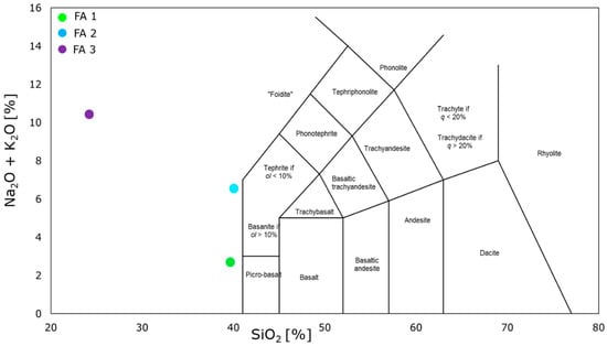 Due to the fact that the FA are characterised by unusual-to-natural rock chemical composition (low SiO2 content), high Ca content in all samples, and very high P content in FA1 that were not included in the calculation, it was impossible to classify them using the total-alkali-silica (TAS) diagram (Figure 2). Thus, it was not possible using the main rock classification commonly used in geological studies to classify the FA in any field affiliated to the common igneous rocks. The molar ratio of CaO to the sum of Na2O and K2O for all samples is between 6.69 and 6.80.