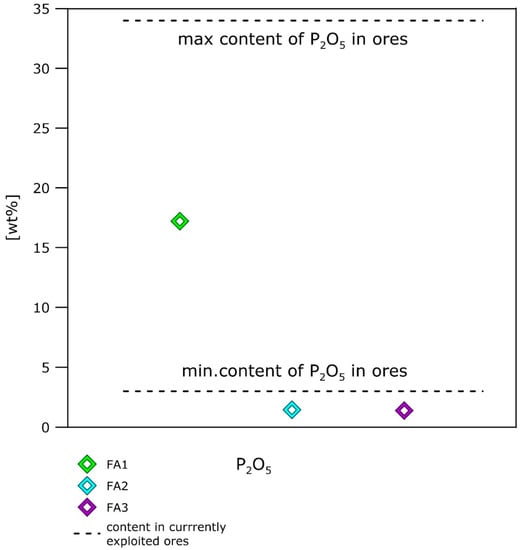 The phosphorus content is very high in the sewage sludge ash (~17 wt% of P2O5), not only in comparison to the average rock composition, but also in comparison to the minimal profitable content and maximal content in the currently exploited raw materials (Figure 6). The P2O5 content in phosphate ores varies from 2–6% to 25–34%, depending on the processing methods, mining and geological conditions, and other factors that place sewage sludge ash at the level of the medium grade ores if used directly without processing for enrichment.