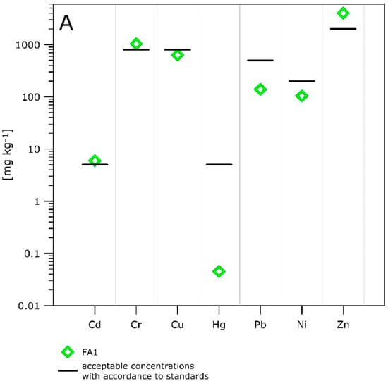 Due to the fact that FA, and especially those from sewage sludge incineration, contain elements which are micro- (e.g., Fe) and macro-nutrients (P, Ca, Mg, K, Al), these could be utilised for plant growth [35]. However, exceeding the concentration limits of Cr and Zn excludes this material from direct use in agriculture, in accordance with the requirements of the EU directive (Figure 7A; Table 5 [36]). For solid organic–mineral fertilisers, the standards for Cr and Ni are exceeded (Figure 7C, Table 5 [37]), but all standards for solid mineral fertilisers are fulfilled in the case of FA in accordance with Polish legislation (Figure 7B; Table 5 [37]).