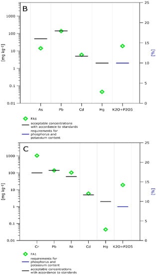 Possible usage of FA1 as fertiliser. (A): direct use in agriculture, in accordance with the requirements of the EU directive; (B): use as solid mineral fertilisers in accordance with Polish legislation [37]; (C): use as organic–mineral fertilisers in accordance with Polish legislation [37].