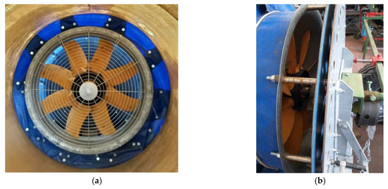 The tests were carried out with an axial helical fan (700 mm diameter), with 8 polyethylene blades (130 mm long), usually mounted on conventional sprayer machines (hydraulic pulverization) that were used in vineyards and orchards (Figure 1a). The blades had an adjustable pitch that assumed five different angles: 20, 26, 33, 40, and 44 degrees, as reported in Failla et al. [25].
