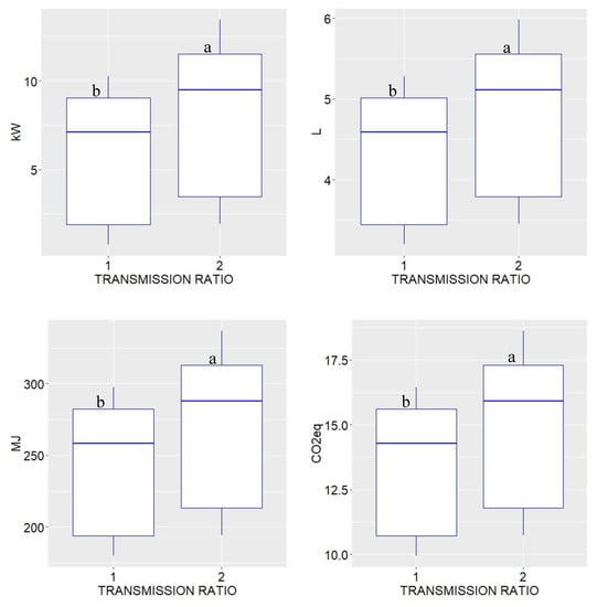 Power required, fuel consumption, energy use, and emissions at the two transmission ratios. Letters (a,b) show between transmission ratio significant difference at p = 0.001 as determined by the Tukey test.
