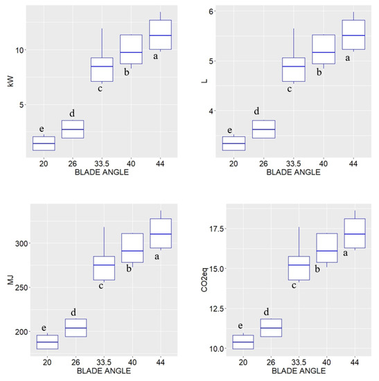 The effects of the different blade angles on power and fuel consumption, energy use, and emissions were statistically significant at p = 0.001, as shown in Figure 4.