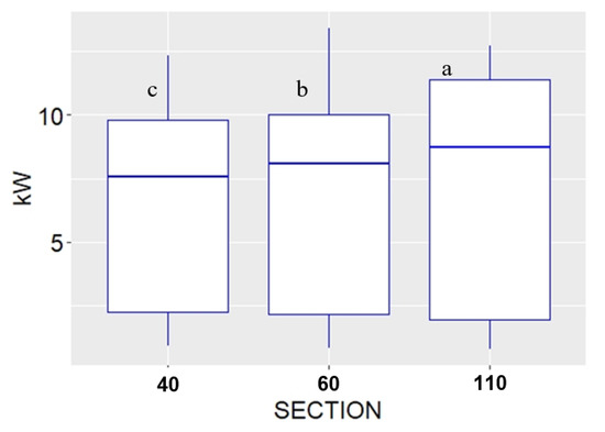 The different outlet section of the air volume produced statistically different power consumption, according to the Tukey test, returning an average value of 6.63 kW in the case of the smaller outlet section (40 mm), 6.86 kW with the medium one (60 mm), and 7.31 kW with the largest one (110 mm). Between the smaller section and the larger one, there was a difference of 0.68 kW; the smaller section led to about 10% less power consumption than the larger outlet section and about 3% less than the intermediate one (Figure 5).