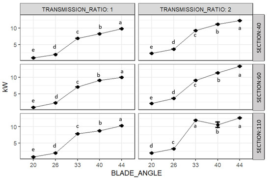 Power required at all layouts. Letters (a–e) show between blade angles significant difference at p = 0.001 as determined by the Tukey test.