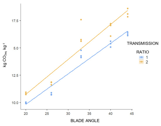 From an environmental impact point of view, focusing on emissions (kgCO2 eq kg−1) at different blade angles and gear ratios (Figure 7) proves that emissions increase in a linear positive mode when blade angles increase. This consideration was even more pronounced with the τ2, where the straight line of the values increased its inclination with increasing blade angles.