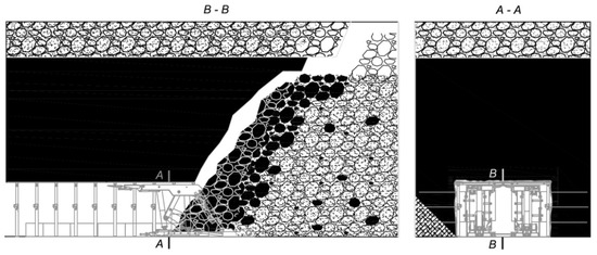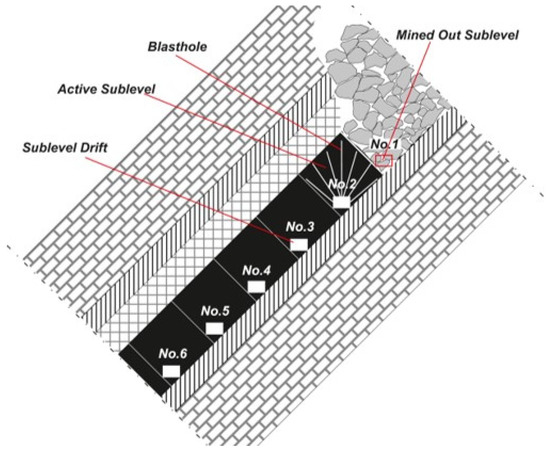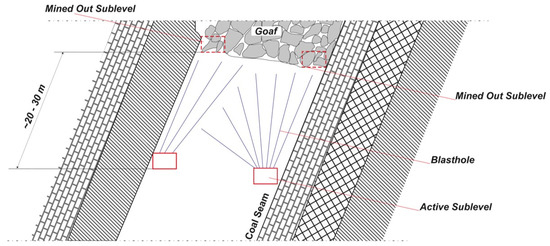 The third system is called sublevel caving, which was the focus of this study. The system is widely applied in underground ore mining [28,29]. Here, top coal is not dropped to the longwall or shortwall, but rather to the excavation system called the “sub-level drift”, which has a cross-section ranging from a dozen or so, to more than 20 m2. Depending on coal seam thickness, one to three sub-level drifts are performed on each sub-level. Extraction is performed by dropping the previously mined coal using fan-cut blasting pattern operations (Figure 3) [30,31,32,33]. Another method is based on hydro-cutting instead of blasting. Water is used in the cutting process for both coal cutting and transportation [34,35,36,37].