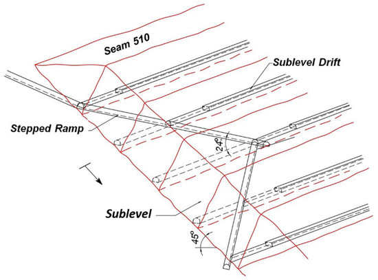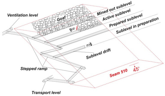 Sub-level drifts constituted the last link in the preparatory working arrangement designed for the sub-level caving system. The workings were cut from stepped ramps with a slight elevation of up to 5° along the coal seam bottom in the places determined by the field subdivision into particular mining panels (Figure 5). The distances between the operating drifts depended on the coal seam thickness; they were usually similar to seam thickness but no shorter than ca. 15 m.