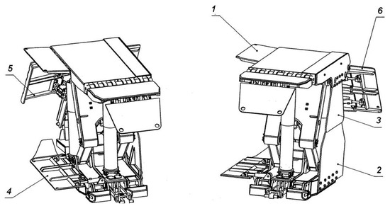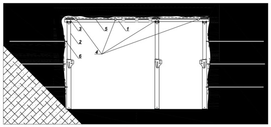 Internal and external sides of a powered roof support (PRS). 1—internal cover of the canopy, 2—external cover of the base, 3—external cover of the canopy, 4—internal cover of the base, 5—internal protection against caving, and 6—external protection against caving.