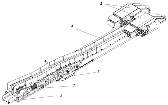 The conveyor supplied the coal to subsequent chain and belt conveyors that were arranged in series in the sub-level drift and other workings toward the shaft. Released coal streaming was controlled by opening and closing of the internal protection against the caving of the PRS section (Figure 9).