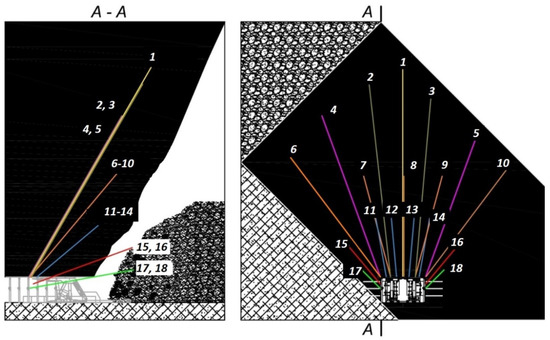 Each time when mining started in the sub-level drift, the start-up blasting works were conducted using a different procedure than the standard method applied during regular mining. After completion of the start-up blasting works (i.e., after full caving in the whole cross-section of the given mining panel), the coal seam was extracted upon borehole drilling, explosive charging, and blasting, in accordance with one of the blasting procedures designed for regular coal mining. Figure 12 presents a sample diagram of blasting borehole distribution. Blasting boreholes were drilled for mining purposes using one VPS-01 portable stand drilling machine. Usually, the boreholes for mining blasting had a diameter of 45 mm and the length of up to 30 m. Barbaryt 4HM explosive (Nitroerg, Bieruń, Poland) was mainly used in blasting works; it is a nitroglycerine-based material applied in coal deposit blasting in the presence of methane. The boreholes were plugged by clay wads packed in paper containers. Detonations were conducted with the use of the Nitrocord 8 pentrite detonation cord (Nitroerg, Bieruń, Poland) initiated by either Ergodet 0,.5AN instant or Ergodet 0o45A25M millisecond electric detonators (Nitroerg, Bieruń, Poland).