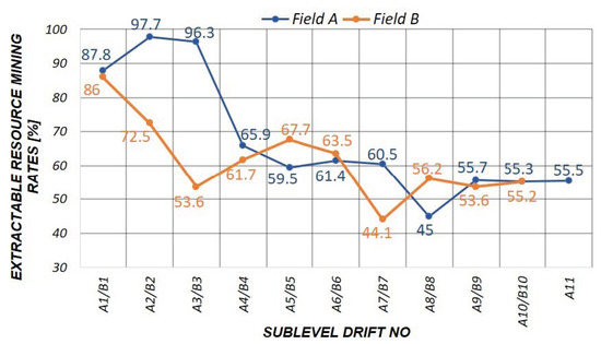 In the fourth sub-level drift of Field A and the third in Field B, we observed a considerable increase in resource losses. The rate dropped to ca. 66% and 54%, respectively. Later, rate stability was observed at the level of more than 60% in both sub-level drifts. This was followed by a sudden drop in the rate (below 45%) in both mining fields and, again, rate stability at a level exceeding 50%. The average extractable resource mining rates of those fields were 67.3% and 61.4%, respectively.
