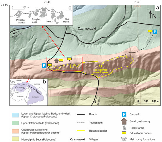Geological sketch of the Prządki Nature Reserve area (a), its location in the Carpathian range (b) [72] and the arrangement of the main groups of sandstone tors [34] (c). Shaded relief based on WMS web service by the Head Office of Geodesy and Cartography [73].