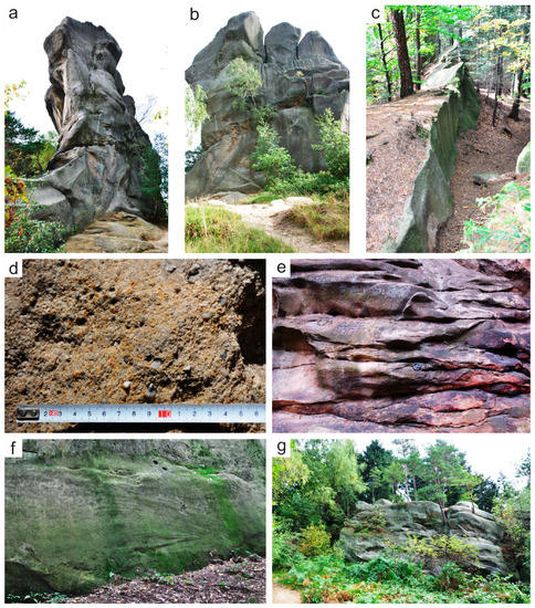 Sandstone–conglomerate rocky formations in the area of the Prządki Nature Reserve: (a) tor of the Prządka–Matka complex; (b) the Prządka–Baba rocky tower; (c) a rocky ridge anthropogenically altered during stone exploitation; (d) pebbles of quartz inside the coarse-grained conglomerate layer of Ciężkowice Sandstone; (e) layers of medium-grained Ciężkowice Sandstone emphasized by weathering processes, with weathering ferricrust visible on the right; (f) a thick layer of fine and close-grained Ciężkowice Sandstone with an amalgamation on the top. Two traces (holes) of mud balls above the amalgamation. Sedimentary structures visible in the center part of the layer with parallel and diagonal lamination; (g) biogenic erosion. Photos by Welc and Miśkiewicz.