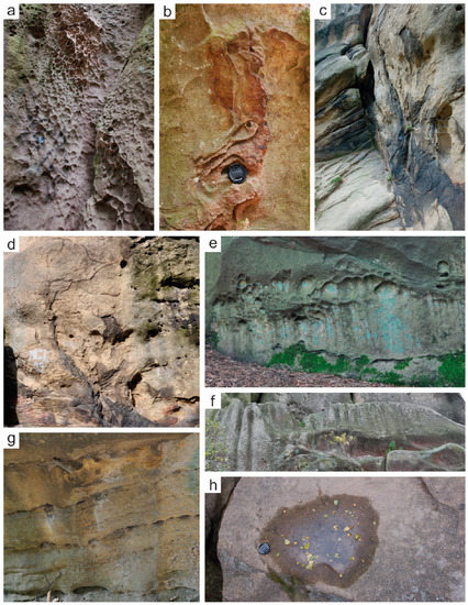 - Weathering pits (Figure 3h), with diameters from several to several dozen centimeters, usually infilled by water and developed on the top surfaces of the sandstone tors.