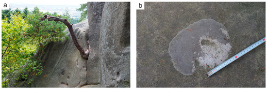 The bioerosion mentioned above is the easiest way to observe the mutual relationships between geodiversity and biodiversity. Trees and shrubs are most often found on and in the vicinity of rocks, and the roots of trees growing into the gaps widen the rocks (Figure 4a). The weathering of rocks, both physical and chemical, is also influenced by lichens (Figure 4b). This influence is observable through their thalluses, which contain individual quartz grains separated from the Ciężkowice Sandstone.